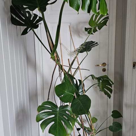 Stor Monstera deliciosa stueplante selges med tungt hjerte pga flytting. Planten har store pene blader med tydelige hull og innskjæringer. Potte og plantestøtte følger med 🪴