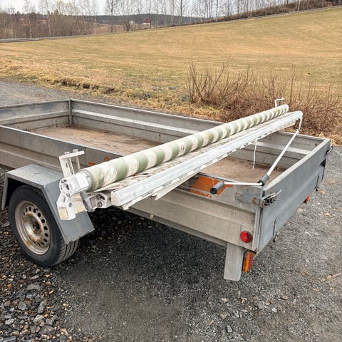 Utvendig manuell terrassemarkise med stripet duk. Markisen monteres på vegg over vindu eller terrassedør for å gi skygge og redusere solinnslipp. Passer til bruk over terrasse eller sitteplass langs husvegg. Leveres som vist på bildene, med duk og markisearmer/festeanordning.