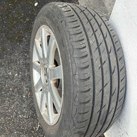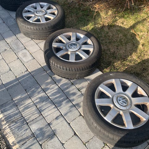 Selger et sett med komplette hjul til VW. . Felgene er meget pene og har veldig gode Nokian sommerddkk med 5 mm og 4 mm mønster igjen. Er slitasje varsler på dekkene ( se bildet). Selges da de i år ikke vil bli brukt. Har stått på en VW. Pene fekk - felger som er godt rengjort både utvendig og inne i felgen