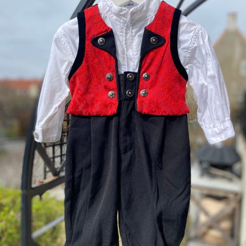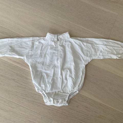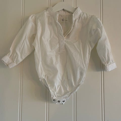 Reflex bunadsskjorte for baby i størrelse 68. Hvit unisex-modell med lange ermer og krage. Plagget er laget i bomull. Praktisk bodyfasong med lukking mellom bena for enkel av- og påkledning.