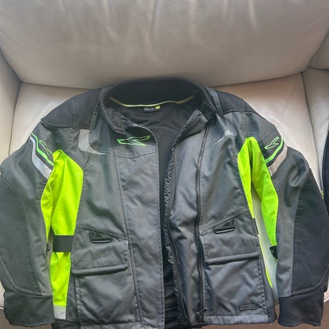 Klim motorsykkeljakke i størrelse medium. Jakken er i tekstil med hovedfarge grå, med svarte partier og gule/high-viz detaljer. Den har glidelås foran, justeringsstropper på ermene og glidelåslomme på ermet. Refleksdetaljer er plassert på overkropp og skuldre for bedre synlighet. Egnet som kjørejakke til motorsykkel og lignende bruk.