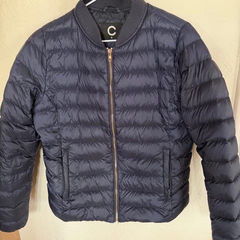 Cubus dunjakke for dame i størrelse M. Jakken er blå og fylt med dun. Den har hette, glidelås i front og horisontale quiltesømmer. Egnet som ytterjakke i kjøligere vær.