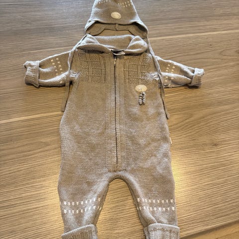 Lillelam ulldress for baby i størrelse 68. Heldress i ull i grå farge, unisex-modell. Dressen har hette og glidelås foran for enkel av- og påkledning. Strikket struktur og detaljer langs ermer og ben. Egnet som ytterlag eller mellomlag for barn i aktuell størrelse.