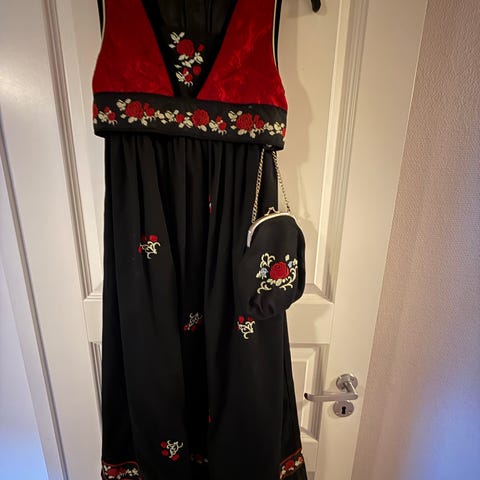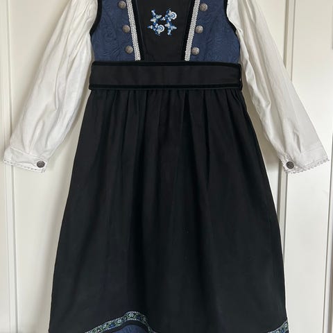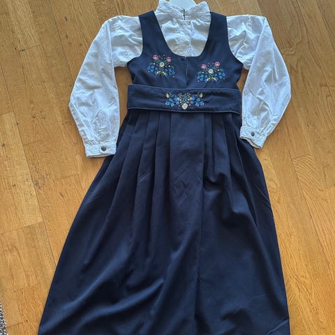 Name it bunadkjole for jente i størrelse 140. Kjolen er flerfarget med mørk stakk, blå overdel og broderte detaljer. Den leveres med hvit skjorte i bomull med broderier foran. Det følger også med en liten veske i matchende stoff med broderier og metallramme. Materialet er hovedsakelig bomull, som gir et mykt og behagelig plagg til bruk ved høytider og andre anledninger.