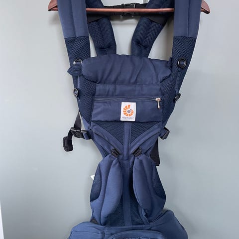 Selger en Ergobaby Omni 360 bæresele i mørk blå farge. Pent brukt, kan vaskes i maskin. Litt misfarget på innsiden ved etter utovervendt bæring - se bilde.