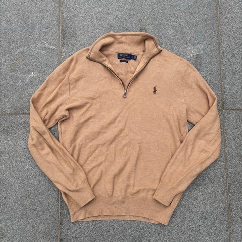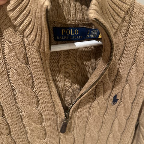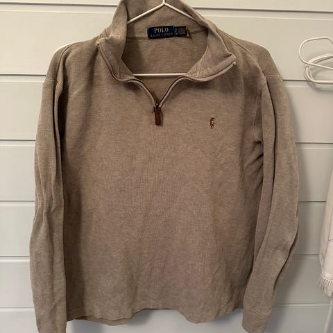 Ralph Lauren Polo genser med halv glidelås for herre i størrelse S. Genseren er beige og laget i bomull. Den har høy hals med kort glidelås i front og ribbestrikkede kanter nederst og på ermene. Diskré Polo-logo er brodert på brystet. Egner seg til hverdagsbruk og kan brukes alene eller over en skjorte eller T-skjorte.