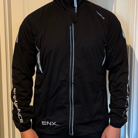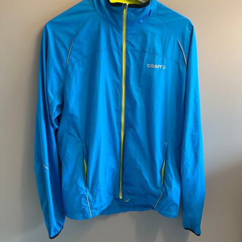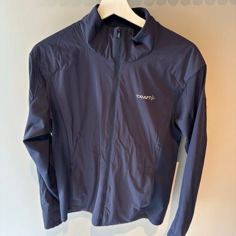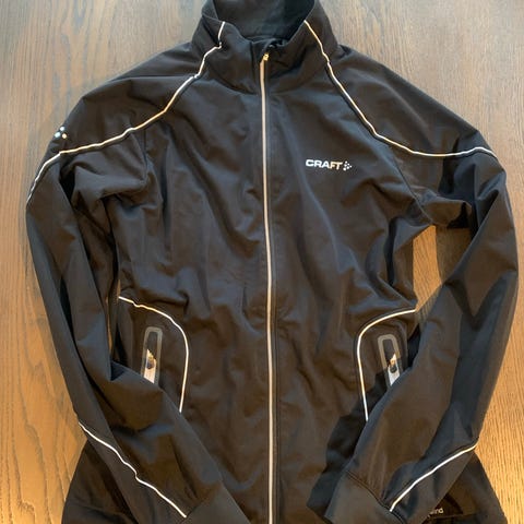 Craft løpejakke for herre i størrelse M. Jakken er svart og har hel glidelås i front. Den har høy krage og lange ermer. Egnet som ytterlag til løping og annen trening utendørs.