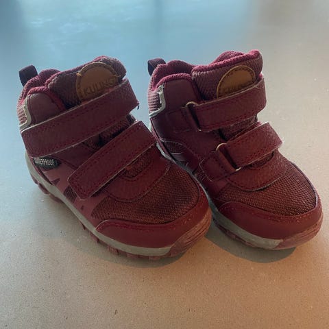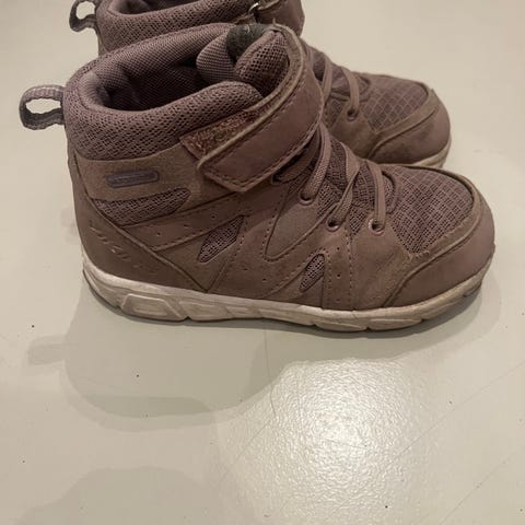 Viking barnesko i størrelse 26. Skoene er i rosa farge med høyt skaft, lisser og borrelås for enkel lukking. Overdelen er i tekstil og syntetisk materiale, med polstret kant rundt ankelen for ekstra komfort. Yttersålen er i gummi med mønster for bedre grep.