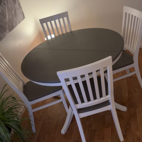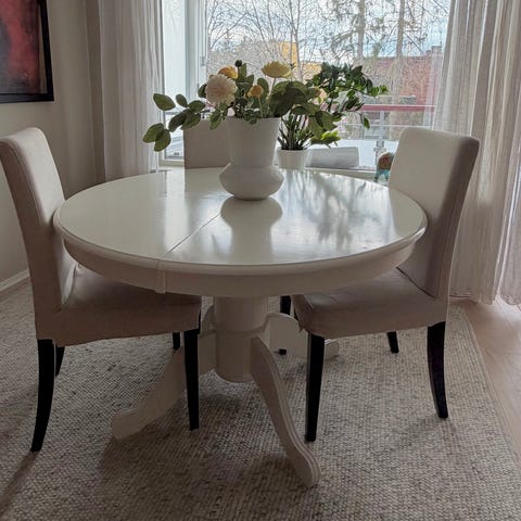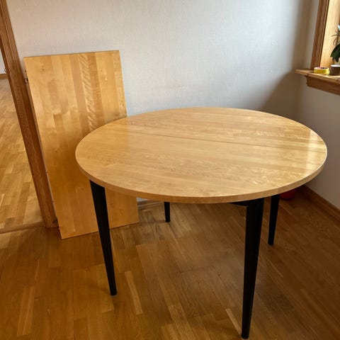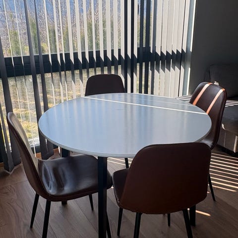 Rundt hvitt kjøkkenbord. Et par små bruksmerker, men ellers pent.