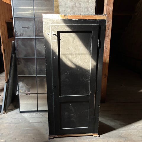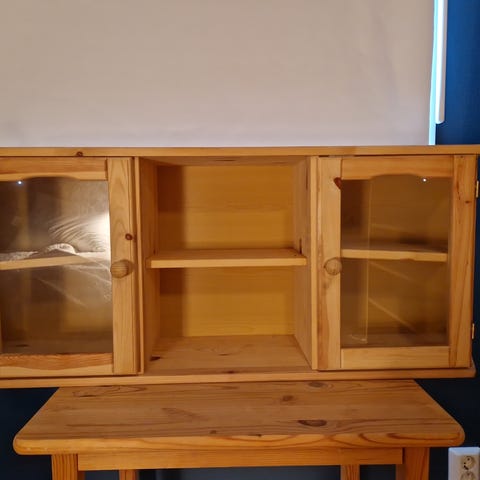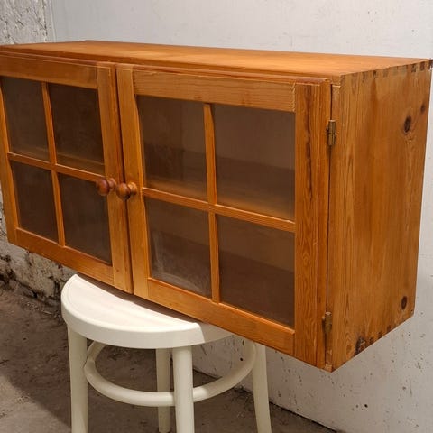 Kjempefint vegghengt skap av heltre. Vet ikke nøyaktig hvilken type tre, men er robust og veldig fint. Kan brukes som den er, men er også veldig fint med litt sliping og ny olje/maling. Innvendig bakplate er ikke heltre.