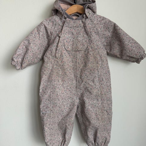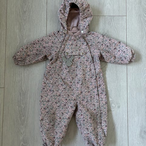 Wheat parkdress for jente i størrelse 80. Dressen er laget i polyester og har et flerfarget blomstermønster. Modellen har hette, elastikk ved ermer og ben samt fotstrikker nederst for å holde dressen på plass. Lukkes med trykknapper og har en klaff foran. Egnet som yttertøy for små barn i hverdagsbruk og lek ute.
