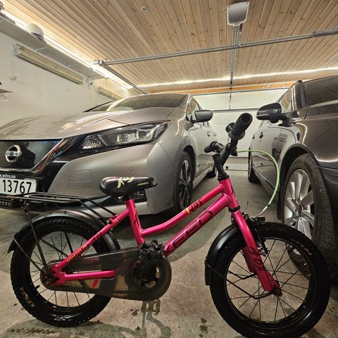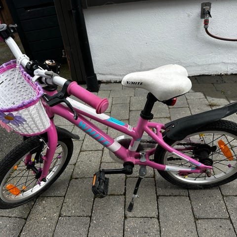 Jennie J.16 barnesykkel med 16" hjul. Sykkelen har rosa ramme med hvitt sete og hvite dekk. Den er utstyrt med bagasjebrett bak, kurv foran og kjedebeskyttelse. Egnet som barnesykkel til hverdagsbruk og korte turer. Støttehjul følger med.