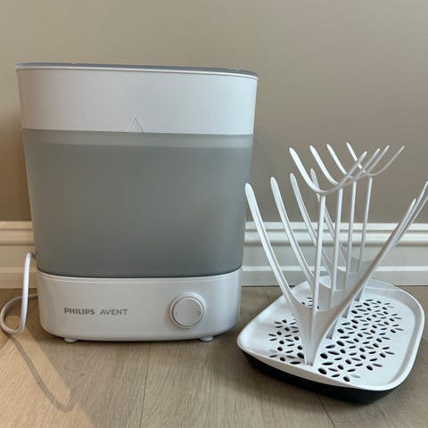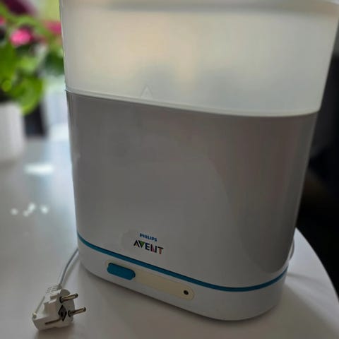 Philips Avent flaske- og smokksterilisator i hvit plast. Enheten er elektrisk og har avtakbar beholder på toppen og justerbar bryter på fronten. Egnet for sterilisering av tåteflasker, smokker og annet babyutstyr som tåler varme. Passer til bruk på kjøkkenbenk med tilgang til strømuttak.