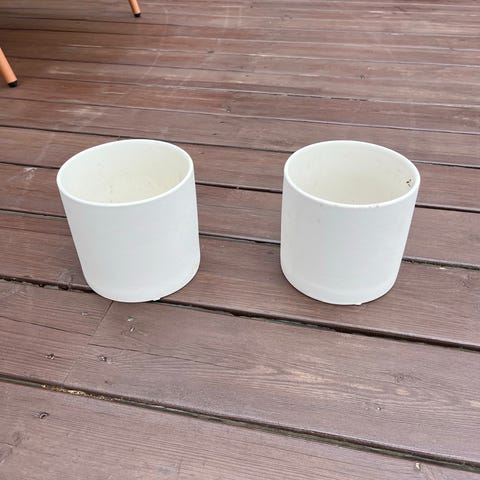 10 ulike blomsterpotter gis bort samlet. To av krukkene har tilhørende sorte fat som medfølger. De er av varierende størrelse (se bilder), alt fra 10 cm diameter til 34 cm diameter. De fleste er i størrelse 14-16 cm diameter.