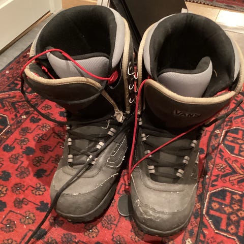 Fint, men godt brukte snowboardstøvler. Gis bort pga ødelagt festepunkt til lisse på høgre sko. Kan antageligvis fikses med litt enkle sy-egenskaper. Sitter ellers egentlig ganske fint og er ein grei støvel, men er for stor i str til meg, så har anskaffet nye og ønsker å gi desse bort til noen som har bedre nytte av dei.