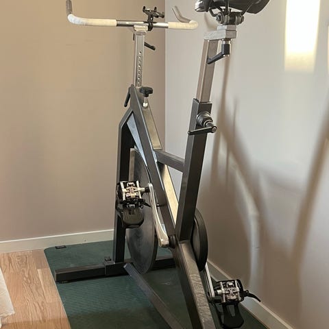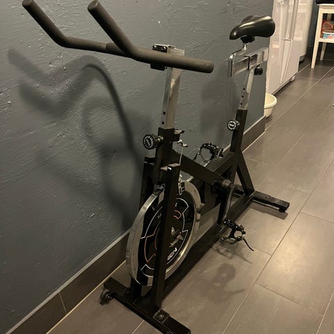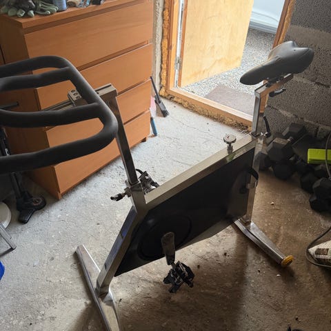 En gammel, fullt brukbar spinningsykkel, Schwinn, gis bort. Det er synlig rust på rammen, men hjulet fungerer godt. Setet og styret kan lett reguleres. Har brukt den daglig et par måneder for trening av hofte. Må hentes.