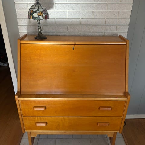 Fint skatoll i teakfinér med uttrekkbart skrivebord og låsbart sjalusi selges.