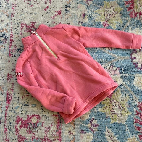 WoolLand genser i ull for jente i størrelse 98. Genseren er rosa med lys tverrstripe på brystet og har lang arm. Den har høy hals med glidelås foran. Plagget er laget i ull, egnet som mellomlag eller ytterste lag på kjølige dager.