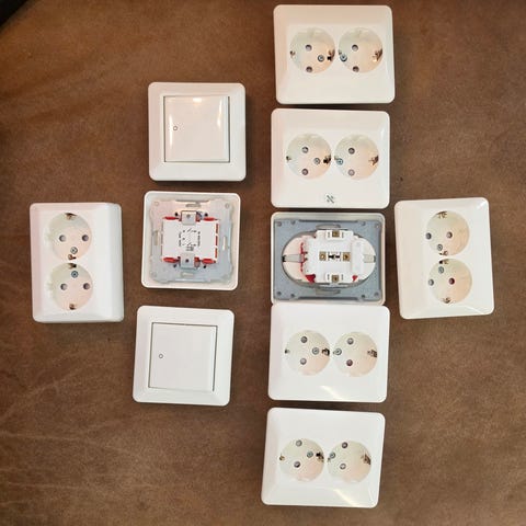 Elko stikkontakter uten jord (28 stk) og flere brytere hvit