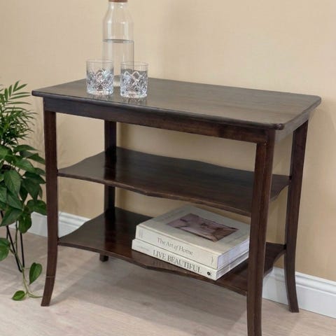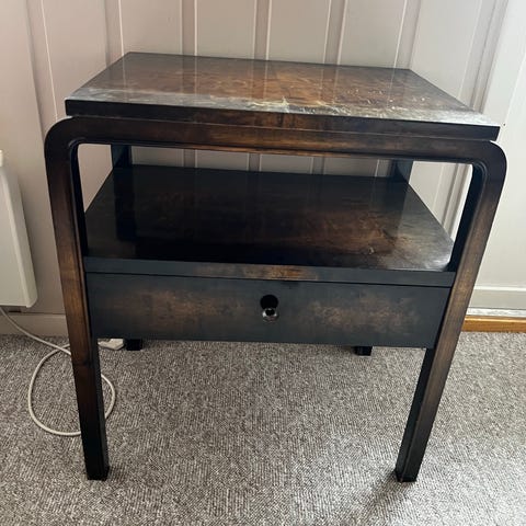 2xNattbord / sidebord i tre, malt grønt. Bordet har én skuff med håndtak foran og en åpen hylle nederst for ekstra oppbevaring. Buede ben og profilerte detaljer gir et klassisk preg. Egner seg som nattbord ved seng eller som lite sidebord i stue, gang eller andre rom hvor det er behov for en liten oppbevaringsplass.
