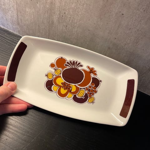 Et strøkent fat med dekoren «August» fra Stavangerflint.