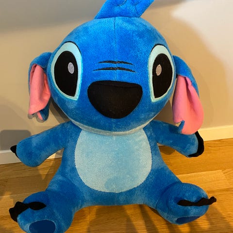 blå Stitch hette med lange ørelapper for barn. Hodeplagget er laget i mykt, plysjaktig stoff og har påsydde øyne og nese i front, samt lange hengende ørelapper med hjerter nederst. Innsiden er i glatt stoff for økt komfort. Passer som lue eller kostymetilbehør for barn.