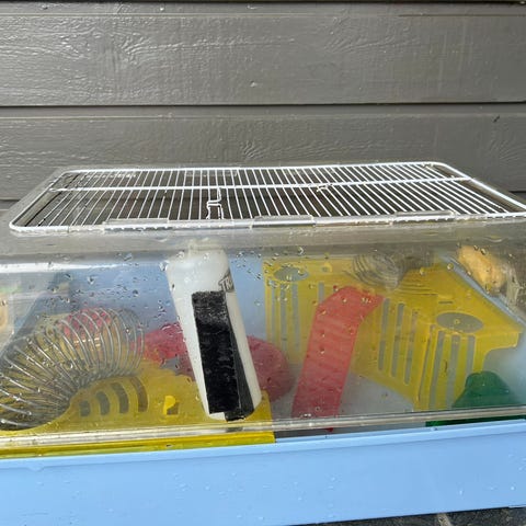 Bur, hus x2, aktivitetsleker, skåler, badekar, toalett og lekeplass (se bildet)
