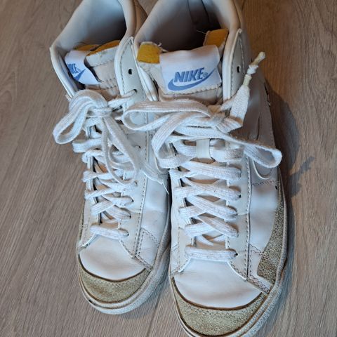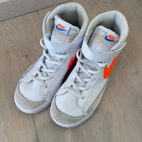 Nike sneakers joggesko i størrelse 37,5. Modellen er en høy variant med overdel i hvitt syntetisk materiale med burgunderrøde detaljer og Nike-logo på sidene. Skoene har lisser foran, polstret ankelparti og gummisåle med mønster for grep. Egnet som fritids- og hverdagssko.