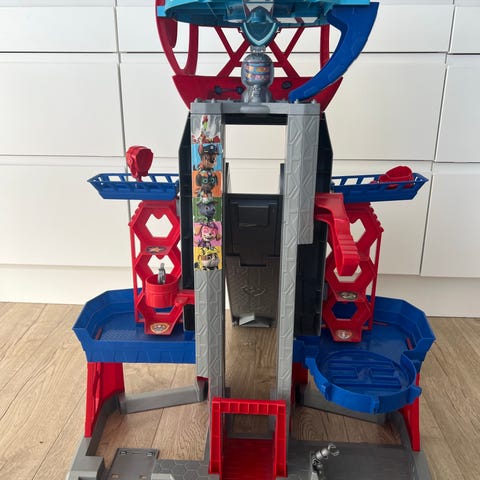 Paw Patrol lekesett med tårn og rampe. Lekesettet består av et tårn med heis og en utfellbar rampe der kjøretøy kan rulle ned. Sky figuren følger med