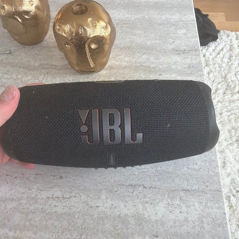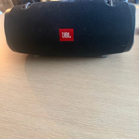 JBL bærbar høyttaler i svart. Trådløs Bluetooth-høyttaler med innebygd batteri og toppmonterte kontrollknapper. Egnet for bruk inne og ute til musikkavspilling fra mobil, nettbrett eller andre enheter med Bluetooth eller kabeltilkobling, avhengig av modellens tilkoblingsmuligheter. Tror det er den første av «Extreme»-modellene. Selges billigst alt fungerer som den skal, men den er litt sliten😌