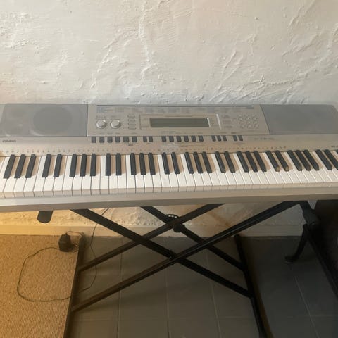 Casio CTK-3200 keyboard med 61 tangenter i svart utførelse. Modellen har innebygde funksjoner som ulike lyder, rytmer og øvingsprogrammer som kan styres via kontrollpanelet over tangentene. LCD-skjerm viser innstillinger og valg. Egnet som elektronisk keyboard til øving hjemme, musikkundervisning eller hobbyspill. Leveres med stativ som vist på bildet dersom dette følger med i annonsen.