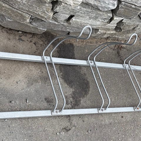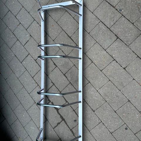 4 stk sykkelstativ med veggfeste i metall. Egnet for oppheng og parkering av sykler i garasje, bod eller lignende.