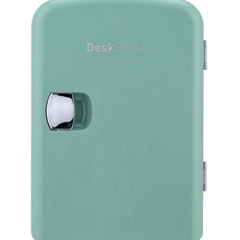 DeskChiller lite kjøleskap i grønn farge. Kompakt modell egnet til plassering på skrivebord eller benk. Innvendig plastkabinett med én hovedsone for kjøling av drikke eller små matvarer. Leveres med strømadapter for tilkobling til vanlig stikkontakt. Passer til bruk på kontor, soverom, hybel eller andre steder der det er behov for et lite kjøleskap med begrenset kapasitet.