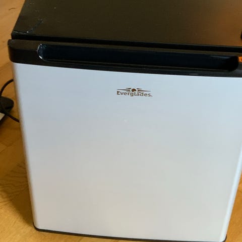 DeskChiller minikjøleskap i kompakt bordmodell. Kjøleskapet har blå utside og hvit innside, og drives med medfølgende strømadapter. Egnet for oppbevaring av mindre mengder drikke eller mat på kontor, soverom eller andre steder der det er behov for et lite kjøleskap med begrenset kapasitet.