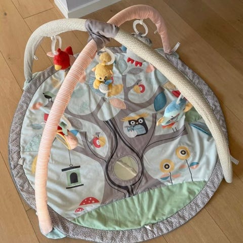 Fin babygym med hengende leker og myk matte. Alt fremstår som pent brukt uten flekker eller anmerkninger utenom noen riper på speilet. Underlaget er helt ubrukt da vi har brukt en egen matte.