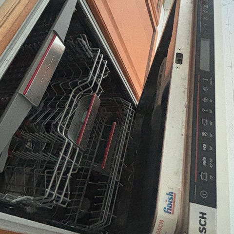 Integrert oppvaskmaskin fra Bosch beregnet for innbygging bak kjøkkenfront. Modellen har flere kurvnivåer, inkludert bestikkskuff øverst og justerbare kurver for tallerkener, glass og kjeler. Frontpanelet har programvalg med blant annet eco- og glassprogram, samt ulike temperaturinnstillinger.