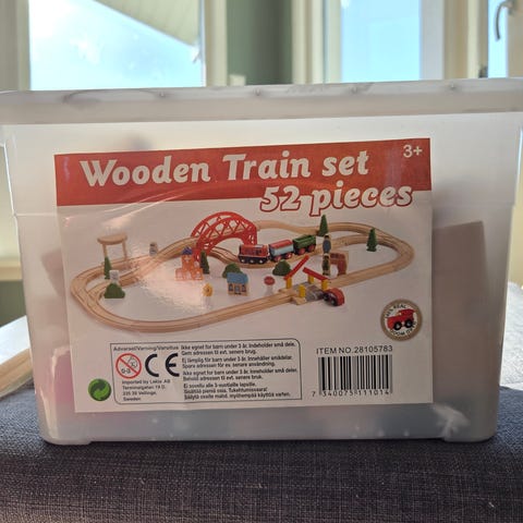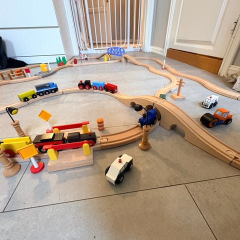 BRIO togbane trelekesett med skinner, kjøretøy og tilbehør. Settet inneholder rette og buede treskinner, runddel og ulike spesialdeler for å bygge flere typer baner. Det følger med flere tog og biler, samt bygninger og elementer som blant annet stasjon og flyplassdeler. Passer til lek på gulv og kan kombineres med andre BRIO-togbaner og treleker i samme system.