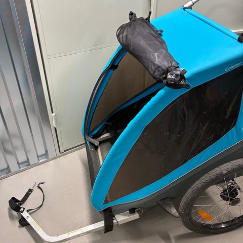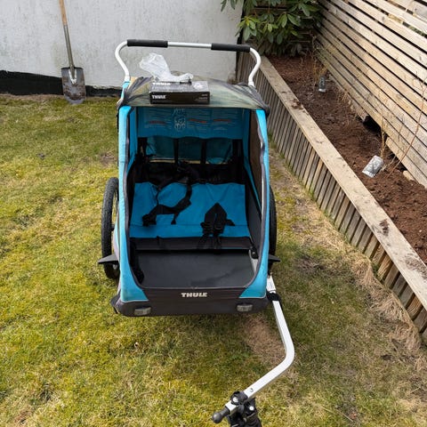 Godt brukt sykkelvogn klar for nye logistiske eventyr. Plass til to barn. Følger med thule infant sling - usikker på om den har de nødvendige delene.