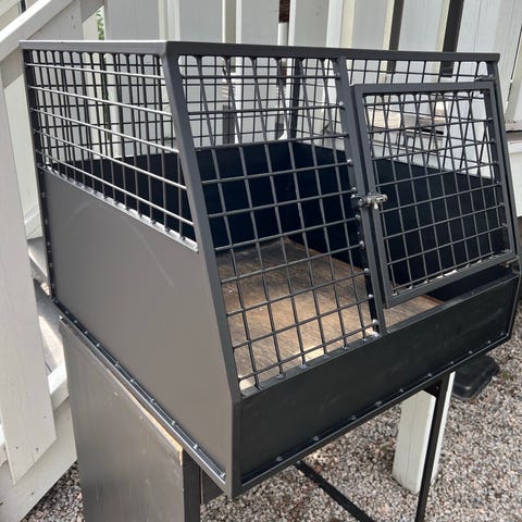 Hundebur bilbur i metall i grå farge. Buret har skrå bak- og frontvegg som er tilpasset plassering i bilbagasjerom til en Volvo V70 (2016) Øvre del av sidene og front har netting for lufting og innsyn, mens nedre del er tette plater. Fronten har dør med netting og doble lukkinger. Egnet for transport og oppstalling av hund i bil