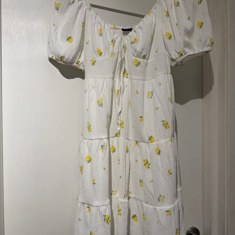 Gina Tricot sommerkjole for dame i størrelse M. Kjolen er flerfarget med blomsterprint på lys bunn. Den har korte puffede ermer, dyp utringning med knyting foran og strikkfelt i midjen for bedre passform. Nederst har kjolen volangkant som gir et lett og luftig uttrykk. Materialet er 100 % polyester. Passer til bruk på varme dager og uformelle anledninger.