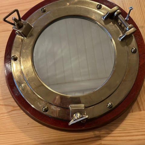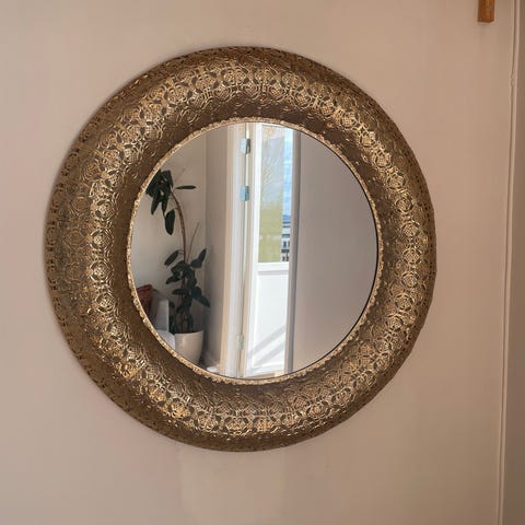 Rundt speil med dekorativ gullfarget ramme. Rammen har utskårne englemotiv og ornamenterte detaljer rundt hele speilet. Passer som veggspeil i for eksempel stue, gang eller soverom. Materialet fremstår som metall eller hard plast med gullfarget overflate. Størrelse er ikke oppgitt, men speilet er rundt med bred, dekorert ramme.