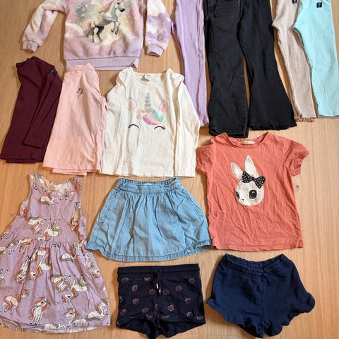 Fin klespakke til jente. I hovedsak i str 110, noen få plagg i 104. Brukt på samme tid. Seks joggebukser, en svart leggings. Fire gensere. En rosa cordbukse, dongerijakke. Hoodie/jakke med enhjørninger på. Mørkelilla varm kjole. Cardigan med korte armer. Normal bruksslitasje.