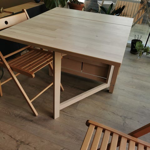 Utgått klaffebord/slagbord fra IKEA i bambus. Synlige bruksmerker/riper. Kan pusses og behandles.