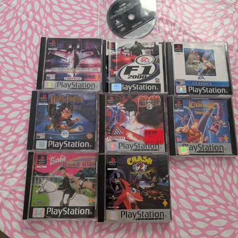 Sony PlayStation spillpakke med åtte originale spill på CD-ROM: med bl.a Xena Warrior Princess, Rayman (Platinum-utgave), Terracon, Hellnight og Porsche Challenge (Value Series). Spillene leveres i originale PlayStation-esker med cover. Egnet for bruk på original PlayStation-konsoll som støtter disse formatene. Selges samlet