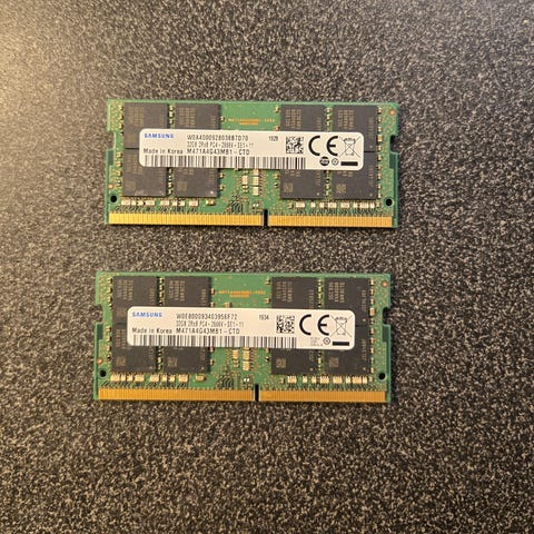 8GB*2 (16GB) ddr4 3200MHz sodimm rambriketter selges grunnet oppgradering til 32GB, virker akkurat som de skal.
