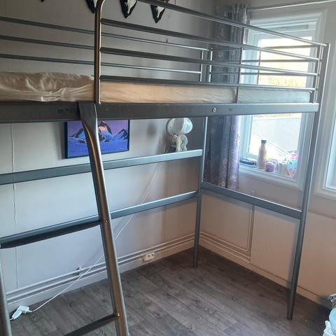 IKEA høyseng i hvitlakkert metall. Sengen står høyt, med stige i metall festet til langsiden. Under sengen er det god plass til skrivepult, oppbevaring eller sitteplass. Sengen har sengehest rundt hele liggeflaten for økt sikkerhet. Madrass følger ikke med. Passer til standard madrass i enkeltseng-størrelse (90x200). Egnet for barn eller ungdom som ønsker mer gulvplass på rommet, eller for studenthybel.