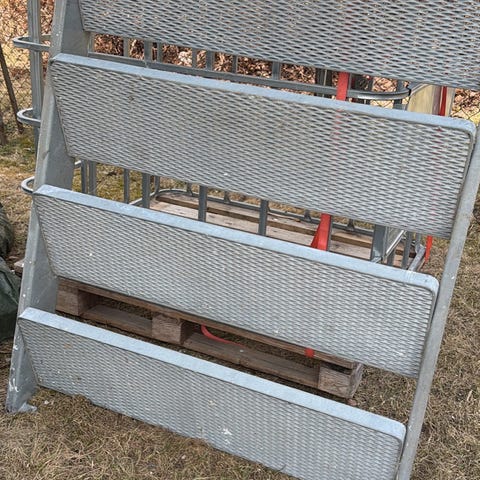 Metalltrapp for utendørs bruk med trinn i strekkmetall og rekkverk på begge sider. Trappen er egnet som adkomsttrapp til terrasse, inngangsparti eller lignende. Rekkverket er i metall med vertikale spiler og enkel dekor øverst. Trappen står fritt og kan tilpasses ny plassering etter behov.