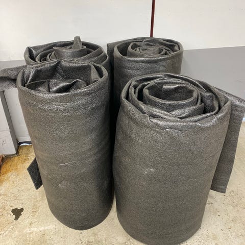Gulvunderlag med aluminiumsfolie. 2 ruller med en grønn skumsiden og en aluminiumsflate. Ubrukt, men ligget en stund. Vet ikke hvor mange meter. Gis bort.