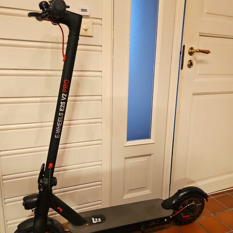 Selger en E-Wheels E2S V2 Long Range i svart. Dette er en populær og driftssikker el-sparkesykkel som egner seg godt til kortere transportetapper, pendling i bymiljø og bruk på asfalt og andre jevne underlag.