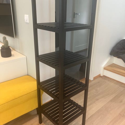 Frittstående hylle med 4 hyller i svart farge. Åpen og ribbet hyllekonstruksjon som gir god lufting rundt innholdet. Passer til oppbevaring i for eksempel bad, bod, gang eller andre rom der det er behov for ekstra lagringsplass. Stabil ramme med fire bein som står direkte på gulvet.